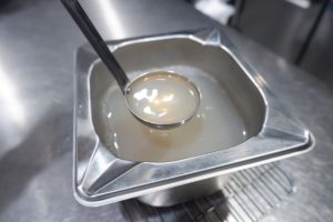 そうすると水分と油脂が分離するので浮いてきた油脂分を取り除きます。