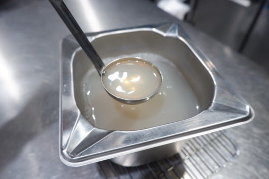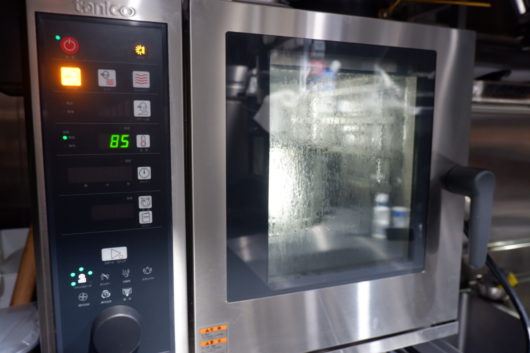 あと分量を決めてスチームコンベクションオーブンで加熱するメリットは他にもあり、誰でも同じ量と味の出汁を作ることができる、というのがひとつ大きなメリットだと思います。