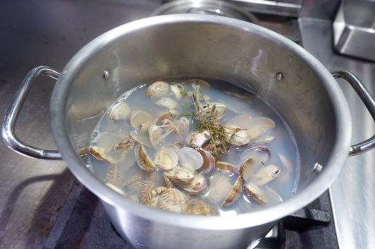 今回はアサリ独特の風味を出さずに全くクセの無い味に仕上げたかったので低めの温度で煮出す方法を取っています。